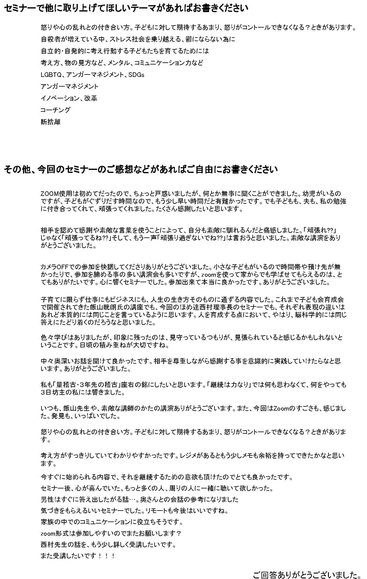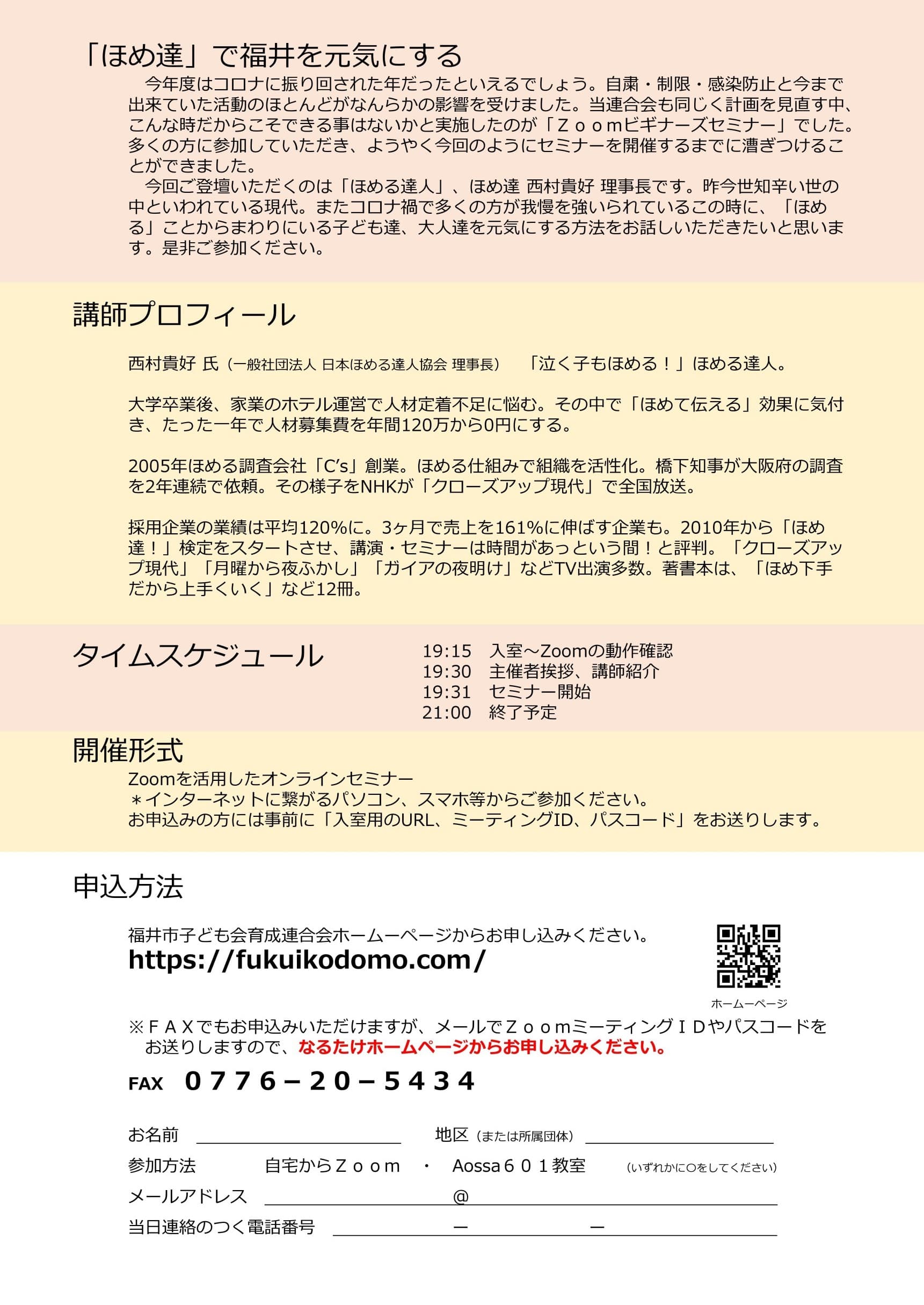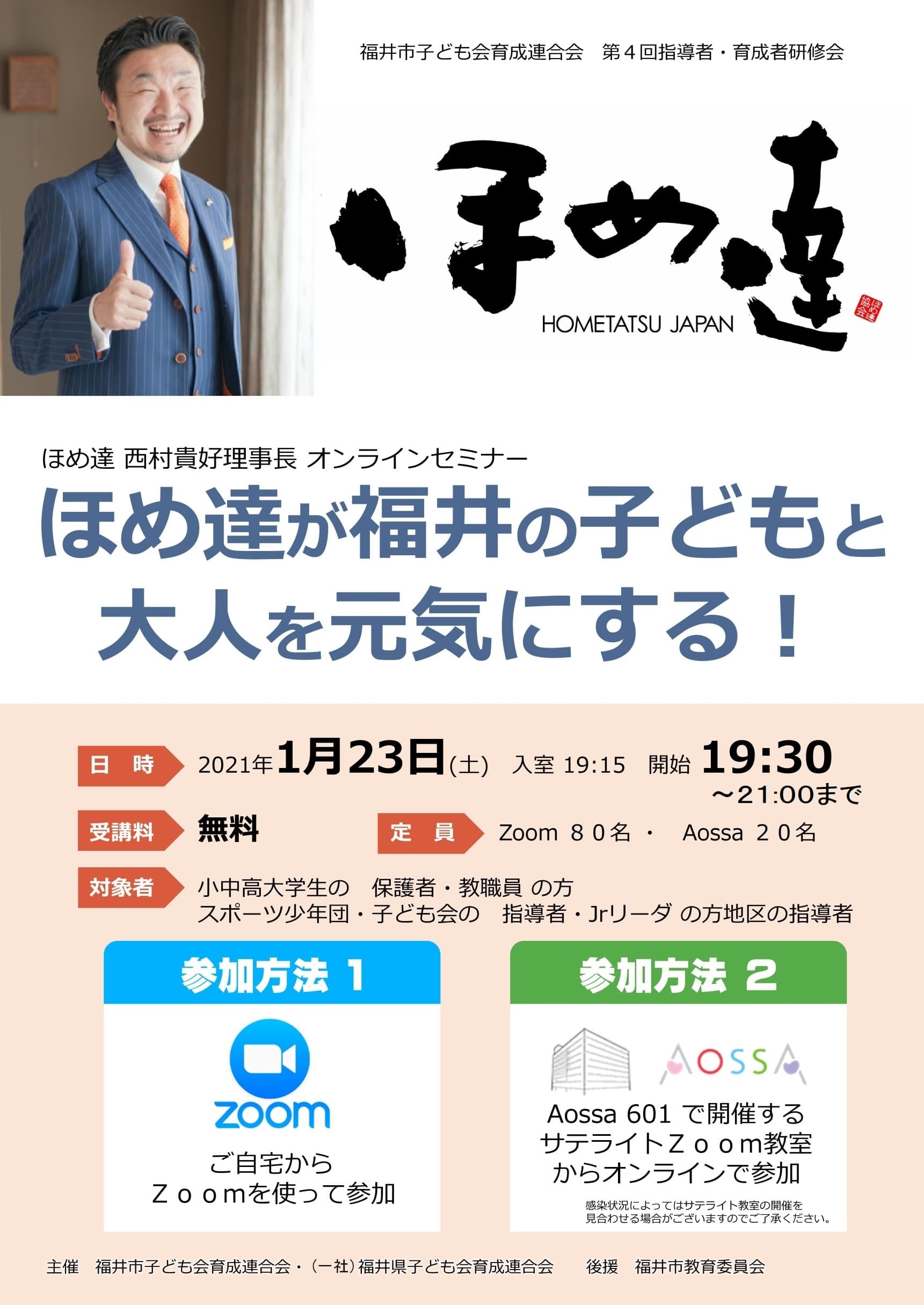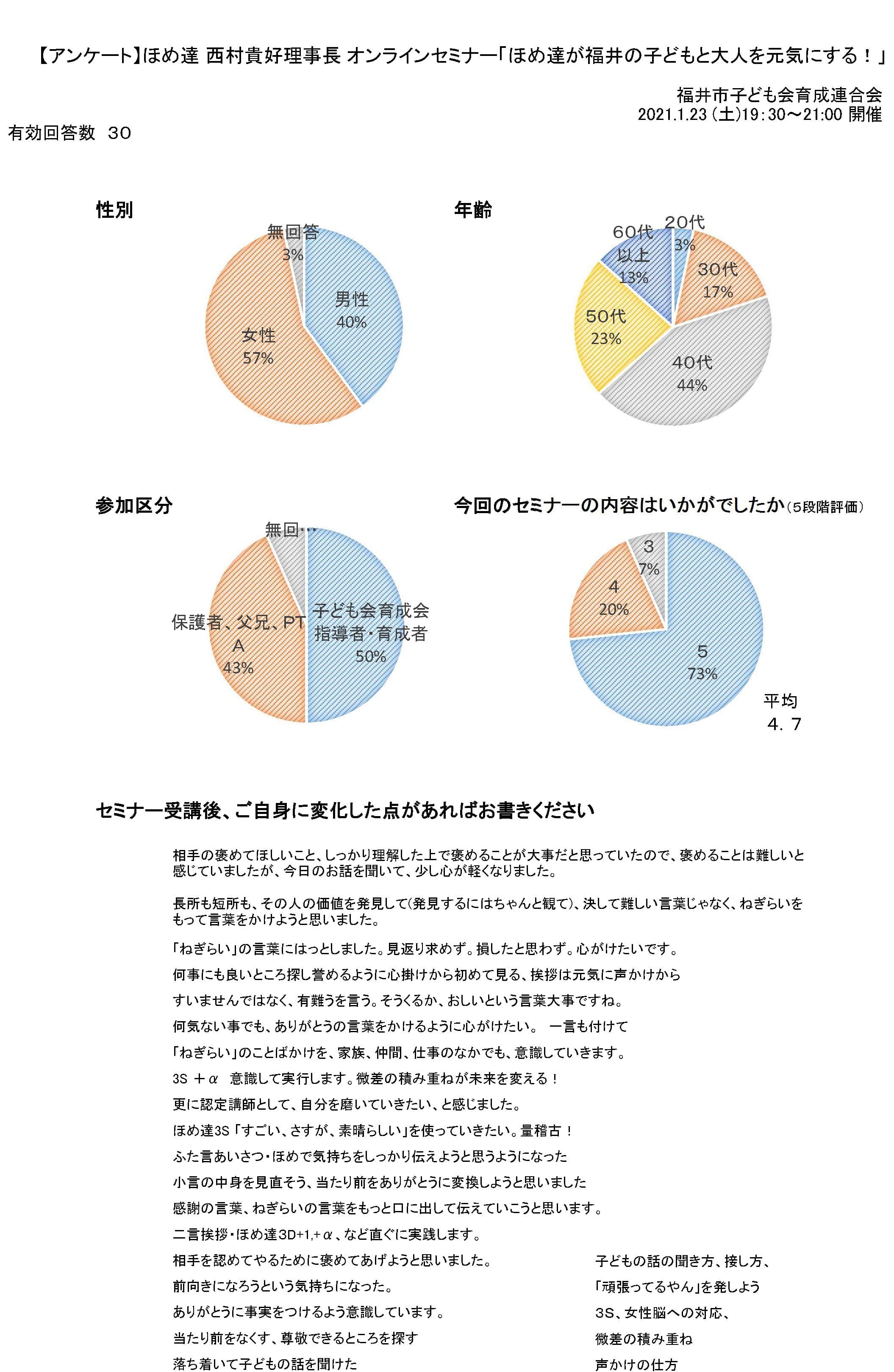 令和2年度 第4回指導者・育成者研修会 ほめ達 西村貴好理事長オンラインセミナー 「ほめ達が福井の子どもと大人を元気にする!」を開催しました。 日時:令和3年1月23日(土)19:30~ 入室19:15 セミナー参加者のアンケート結果 【アンケート結果】pdf
