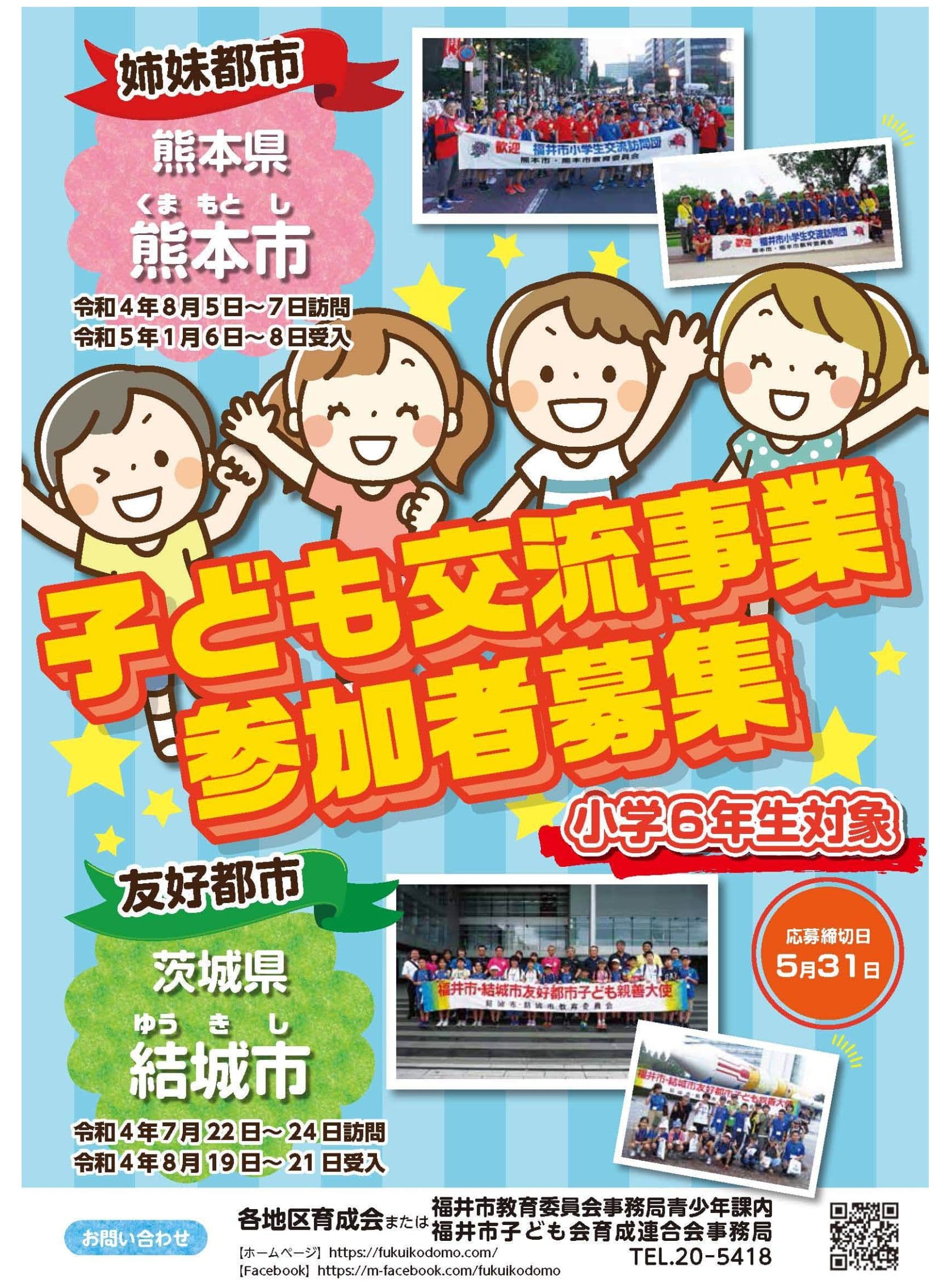 2.目 的 : 平成6年11月16日、福井市、熊本市姉妹都市調印式が行われ、盟約書 が取り交わされたことを受けて、子どもたちが主体となった姉妹都市間の交流と合同学習を深め、将来、両市の発展に寄与することを目的とする。