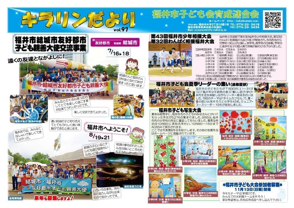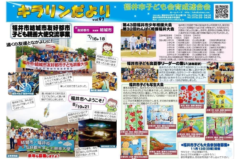 福井市子ども会育成連合会では、小学生の皆さんに向けて広報紙「キラリンだより」を3月上旬に発行しています。市子連としての事業や各地区育成会での事業や活動、ジュニアリーダーズクラブの活動などを記事としてお知らせしています。
