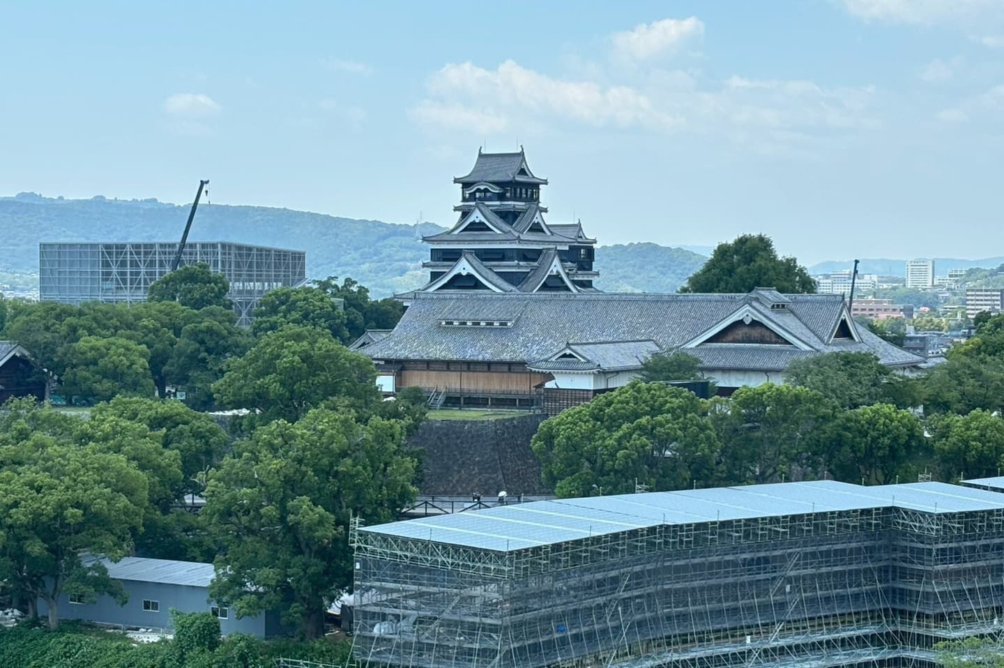 「わくわく座」で熊本城の歴史や地震からの復興を学び、いよいよお城内部の見学へ。天守閣からの眺めや城の作り、色々な展示物をじっくり楽しみました。昼は市役所14階の展望レストランで熊本城を眺めながらランチです。