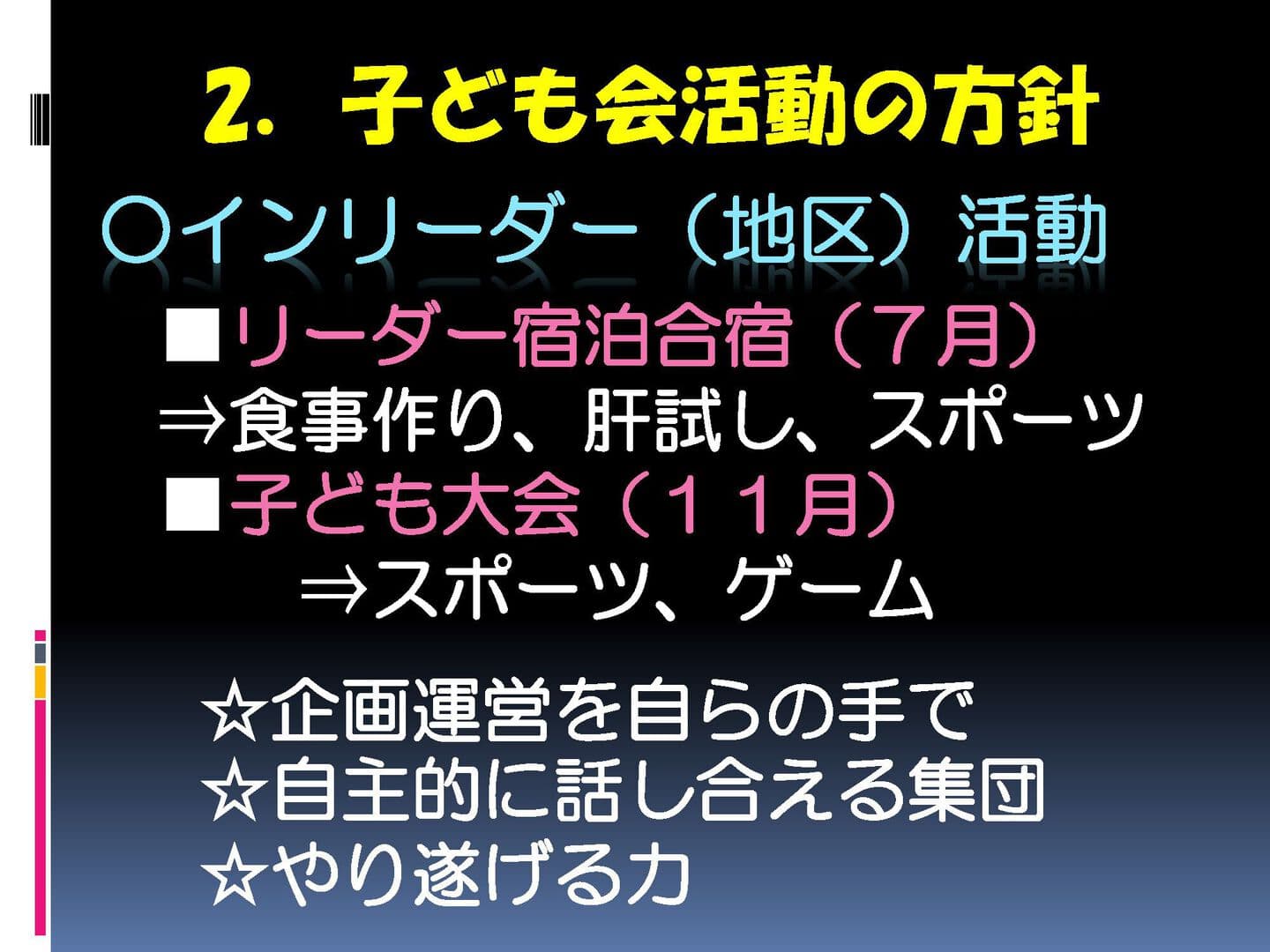 グループ行動を通して、子供の自立心を育む。