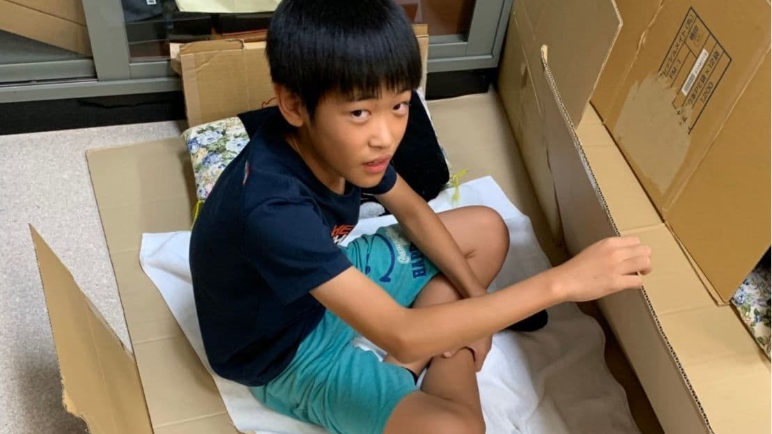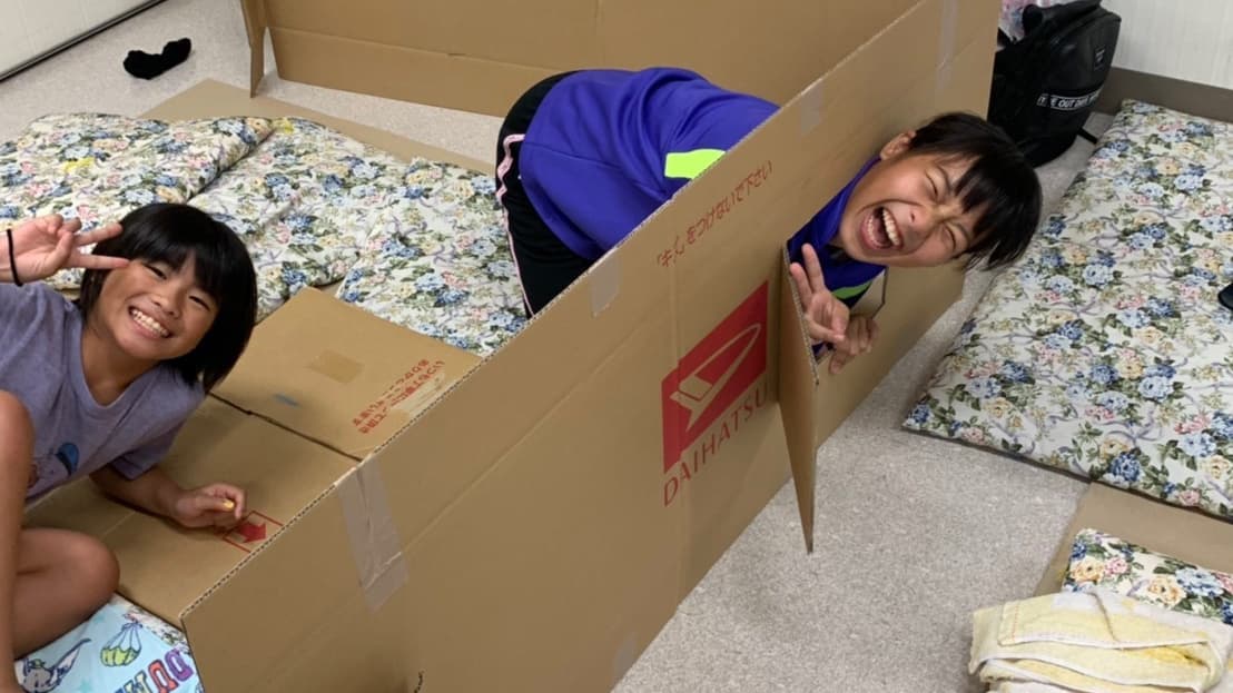 防災について勉強会を行い、段ボールで寝床を作りそこで泊まりました。