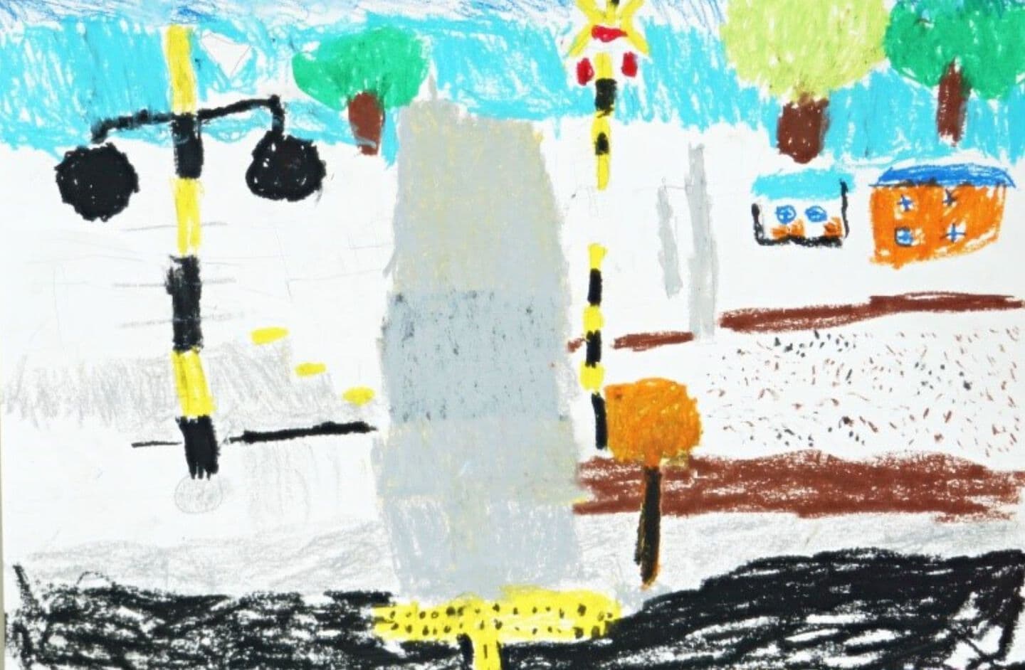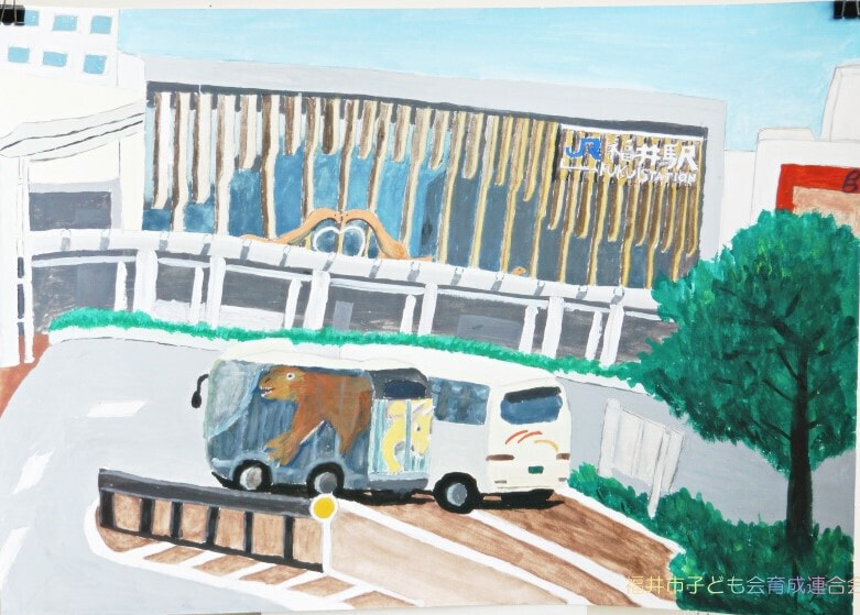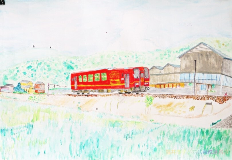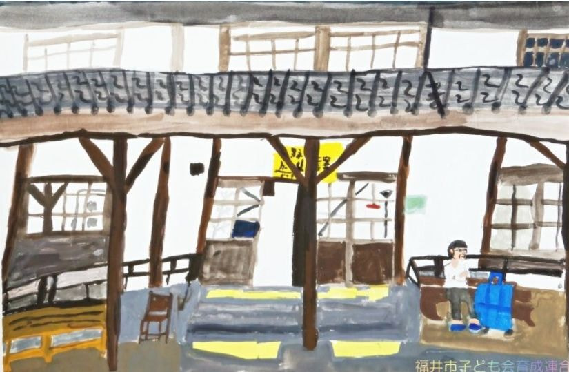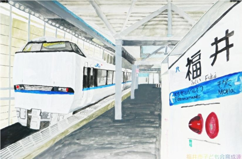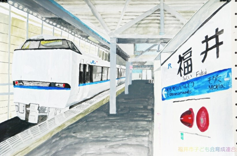 高学年は、描くものや構図の工夫から絵に奥行きを感じることができ、奥行きや重なりを生かした表現が見事でした。4年生の作品は、新しい福井駅とバスを通じて、新たな福井の街の姿を表現しているようです。5年生の作品は、身の回りの駅の風景を描き、何気ない日常を感じます。6年生の作品は、緊張感のある電車やホームから未来に向け、前向きに進む気持ちを感じ取ることができます。