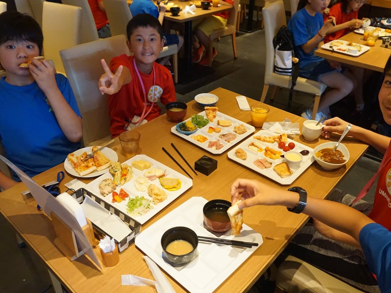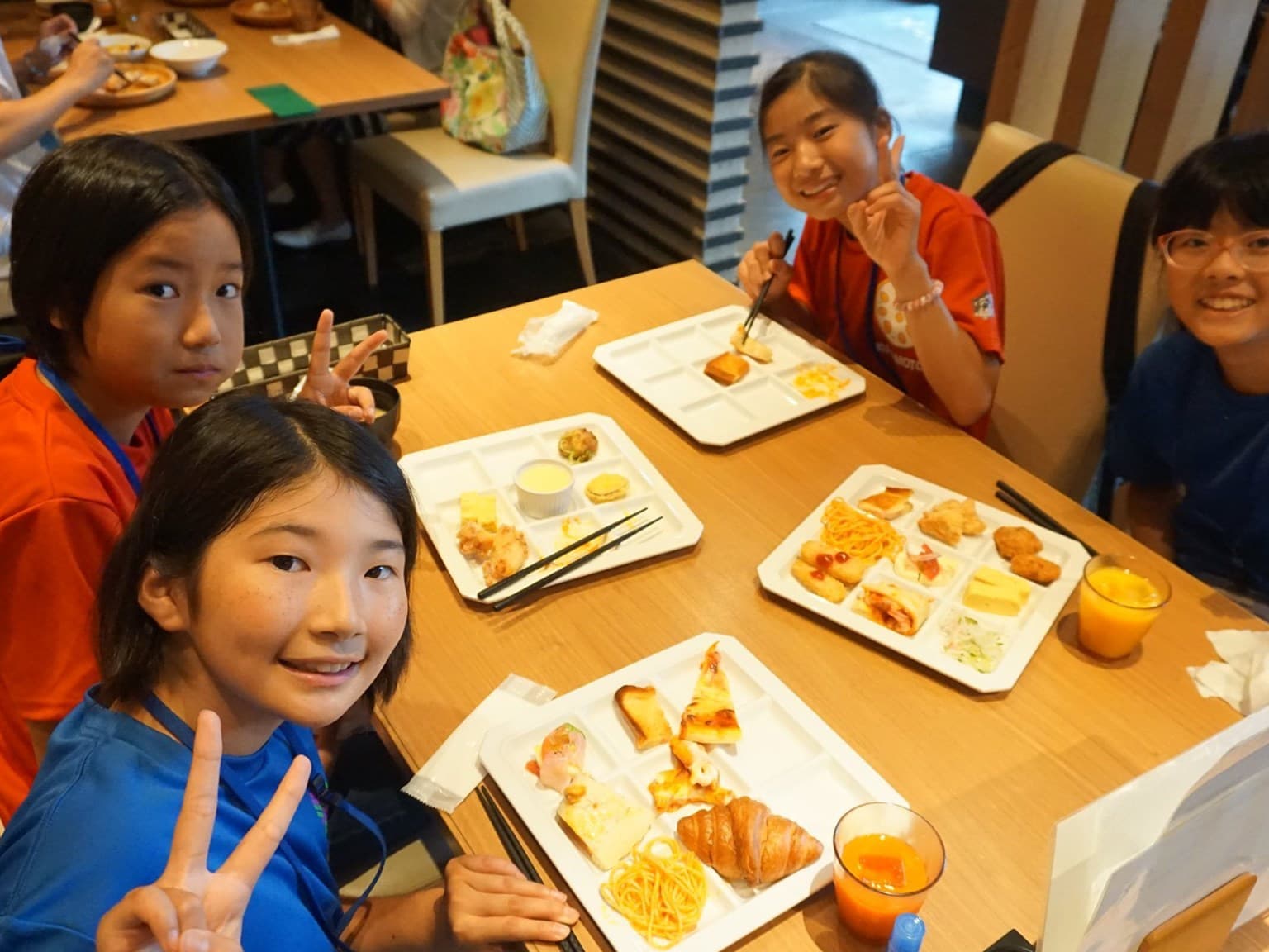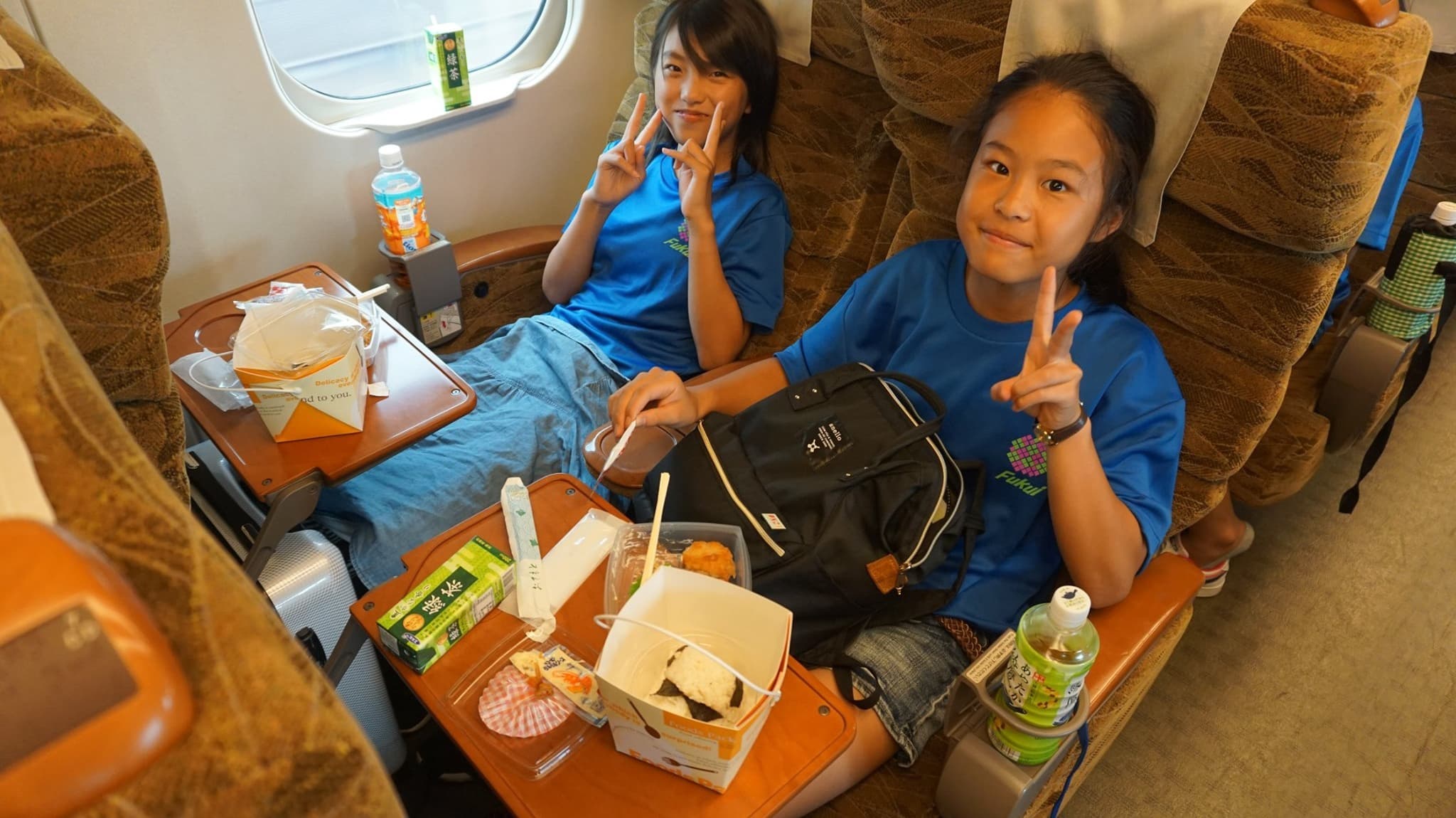 朝が早かった子どもたちは,さっそく,お弁当を広げて昼食タイム。熊本までは約3時間。