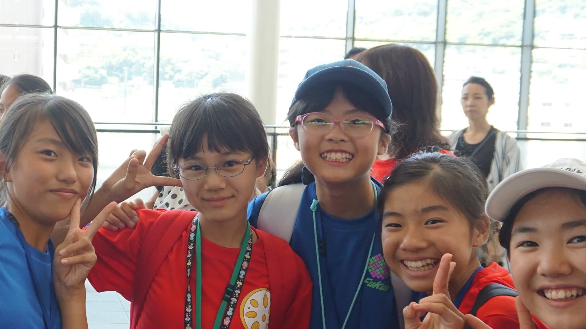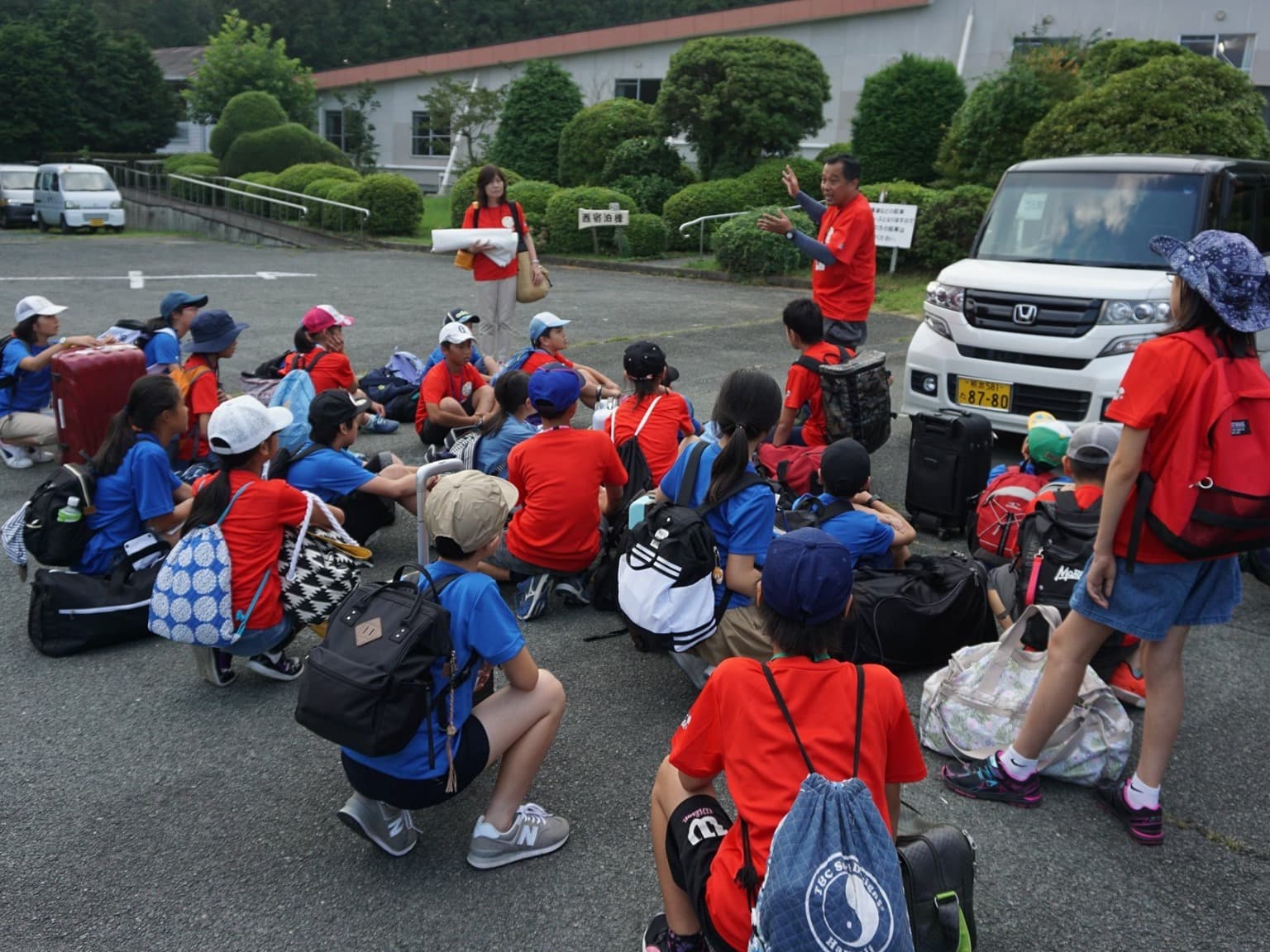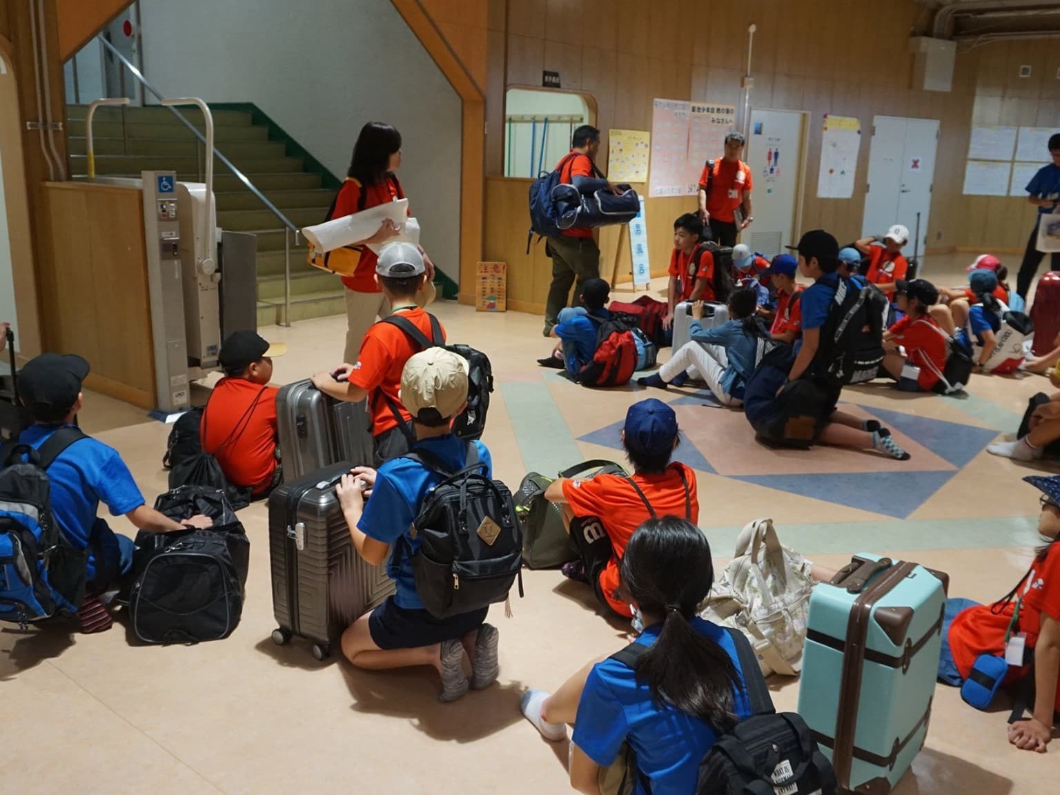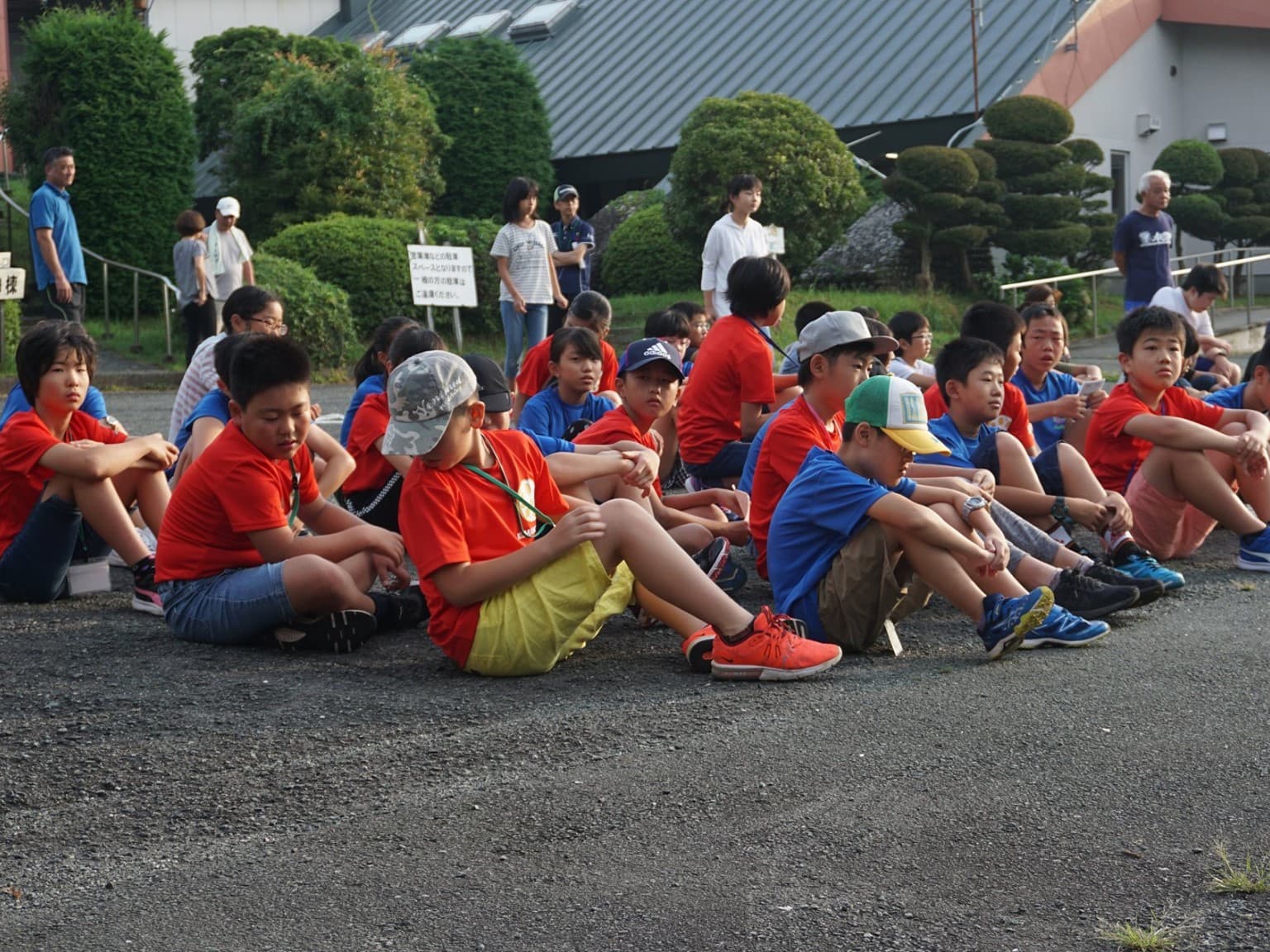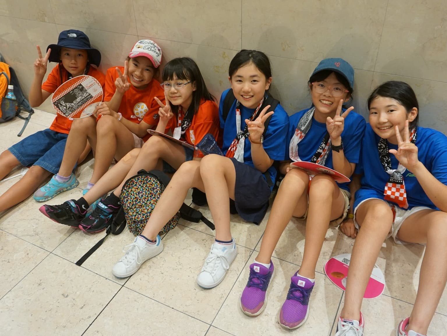 小学6年生男女12人と引率者3人は,青いTシャツを見て,同じ仲間であることを確認し,少し安心した様子。
