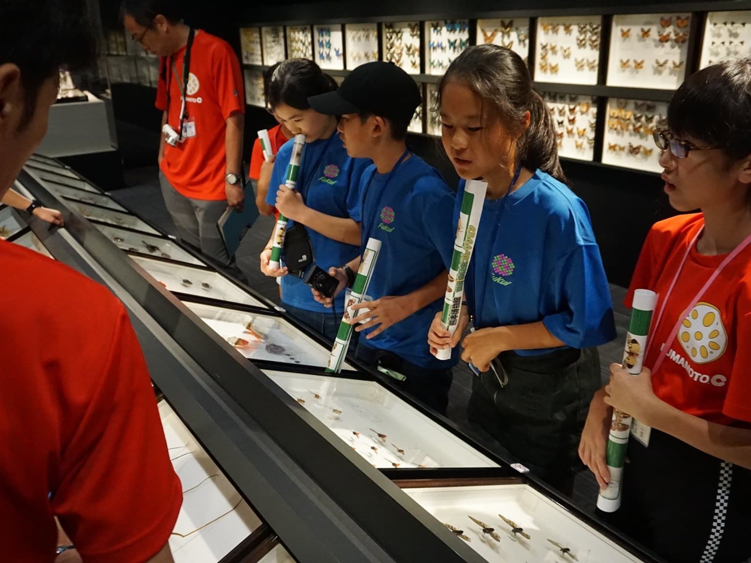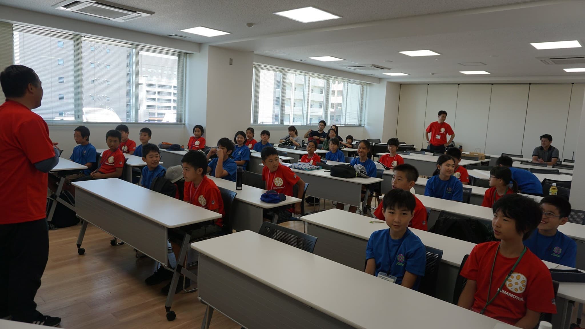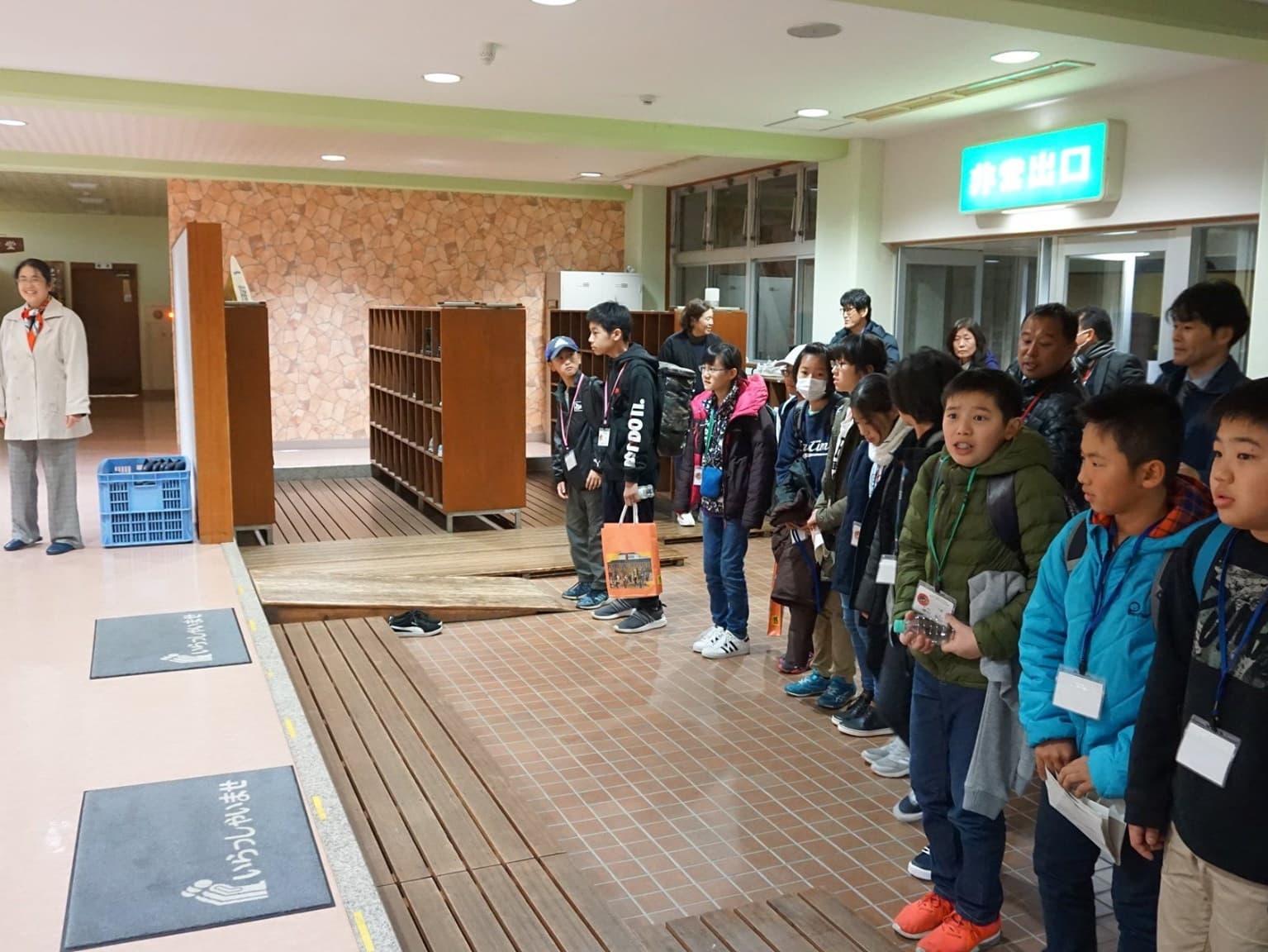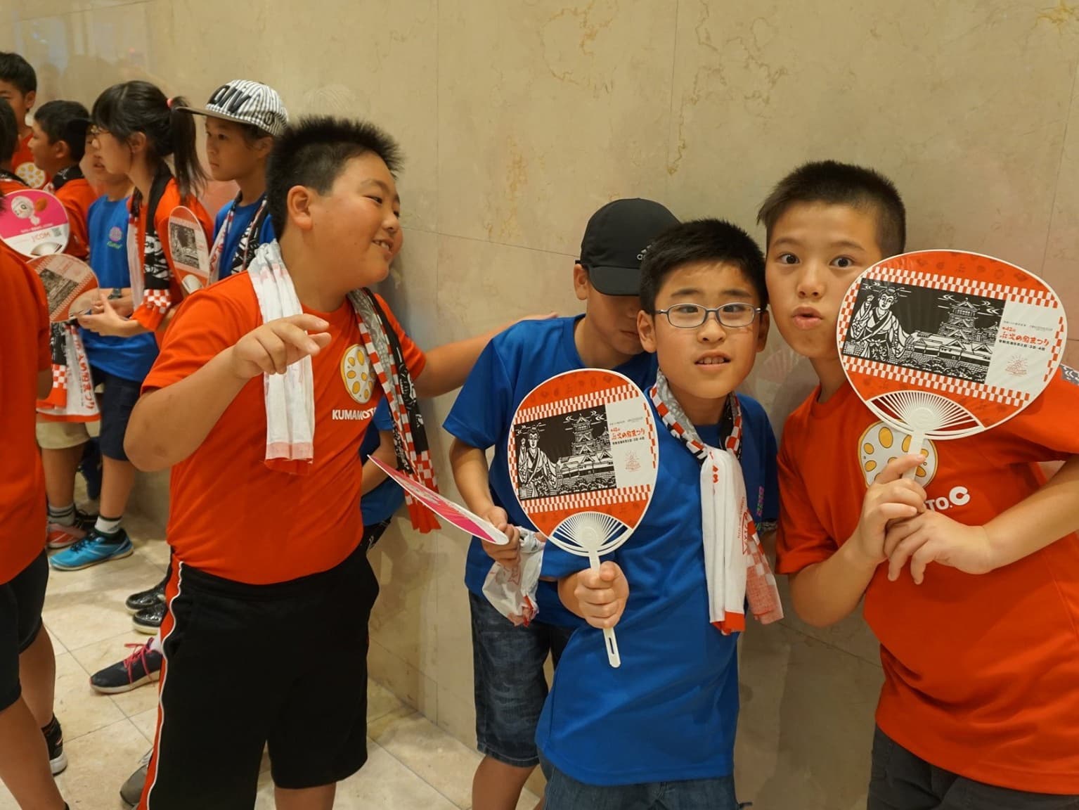小学6年生男女12人と引率者3人は,青いTシャツを見て,同じ仲間であることを確認し,少し安心した様子。