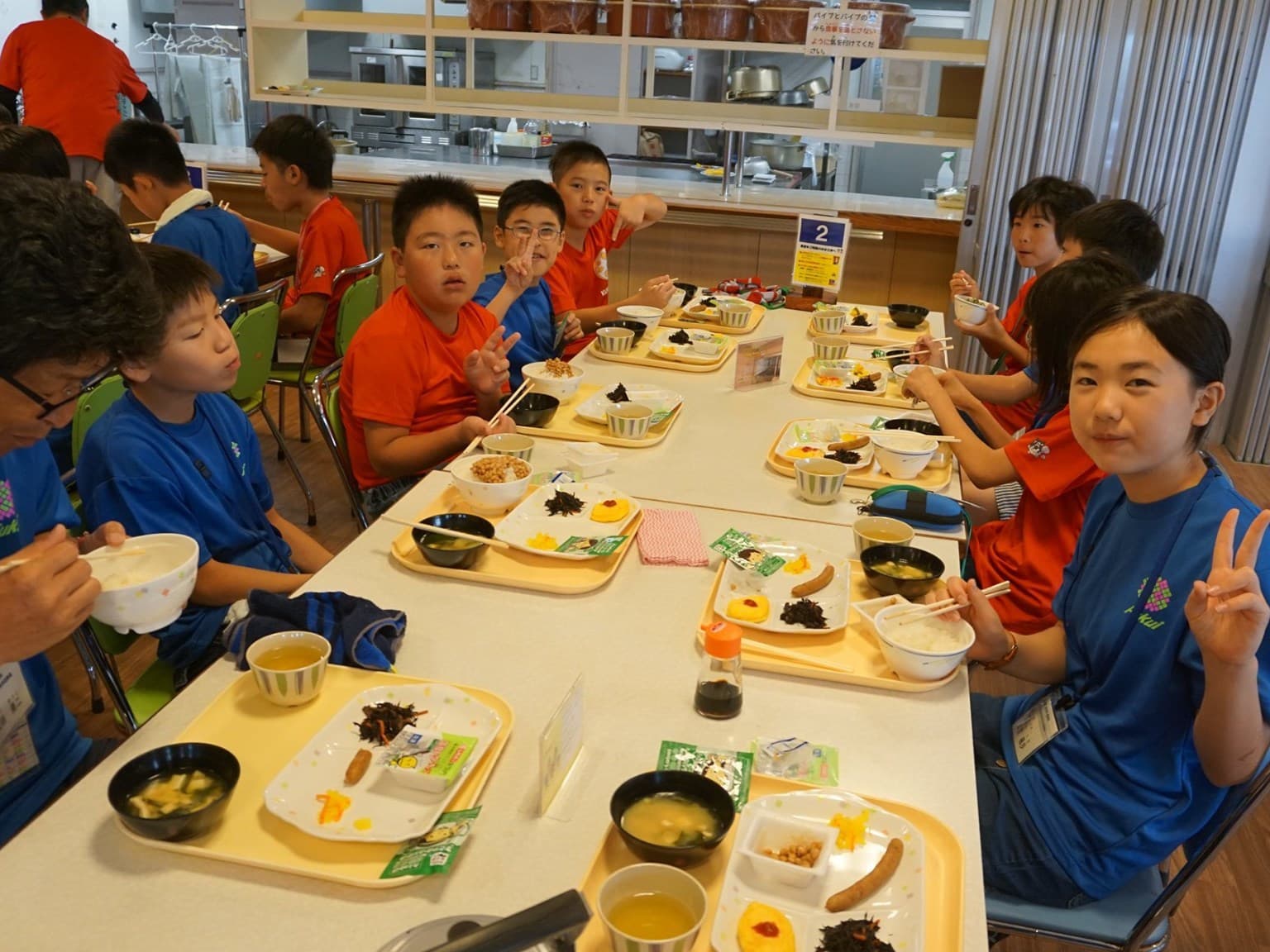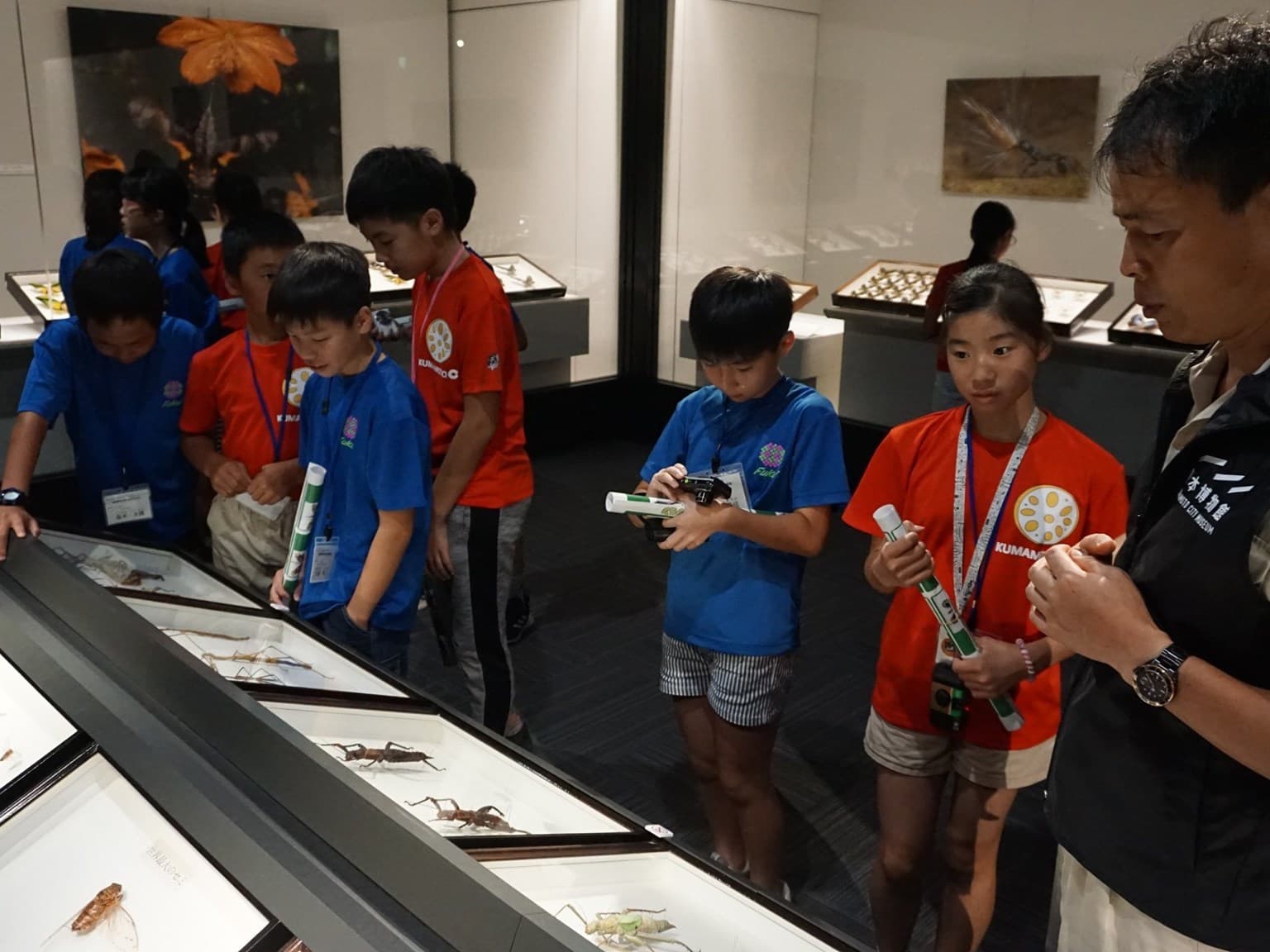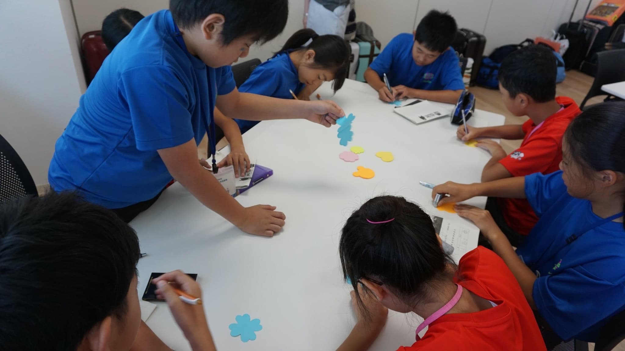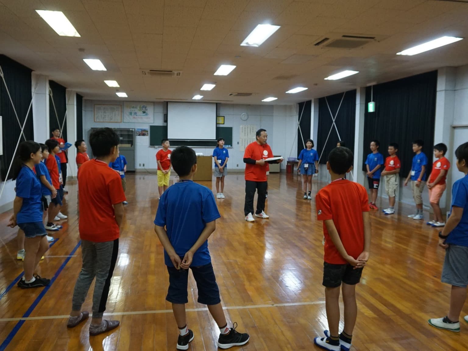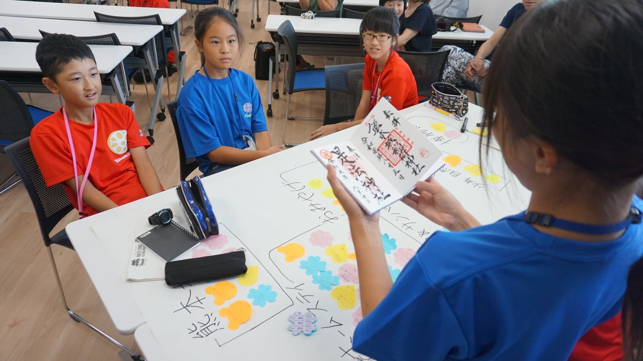 小学6年生男女12人と引率者3人は,青いTシャツを見て,同じ仲間であることを確認し,少し安心した様子。