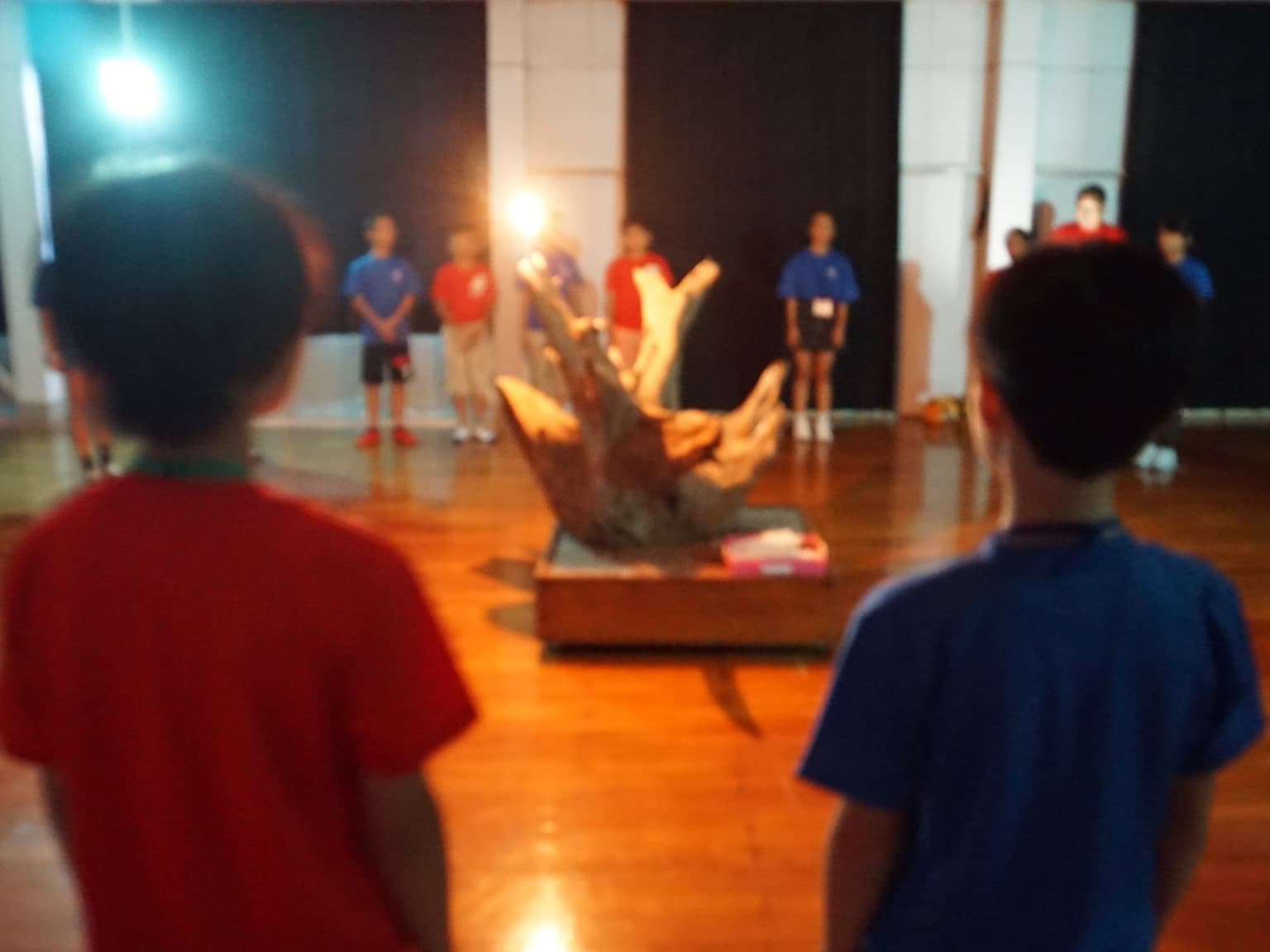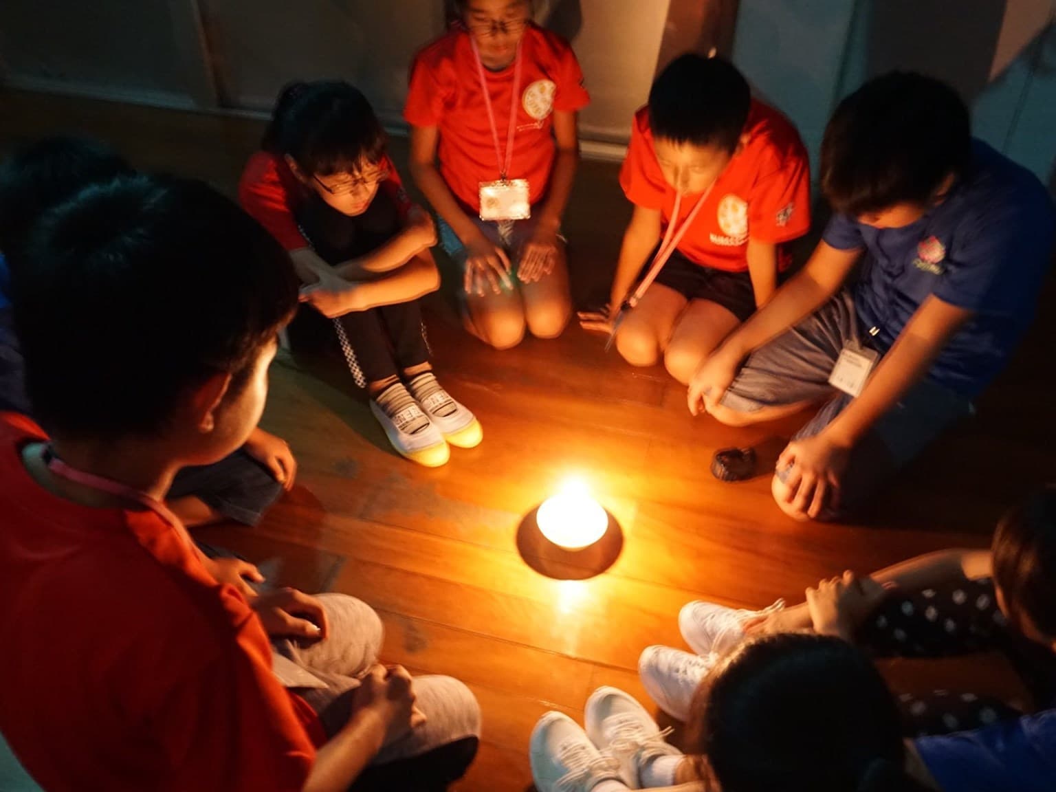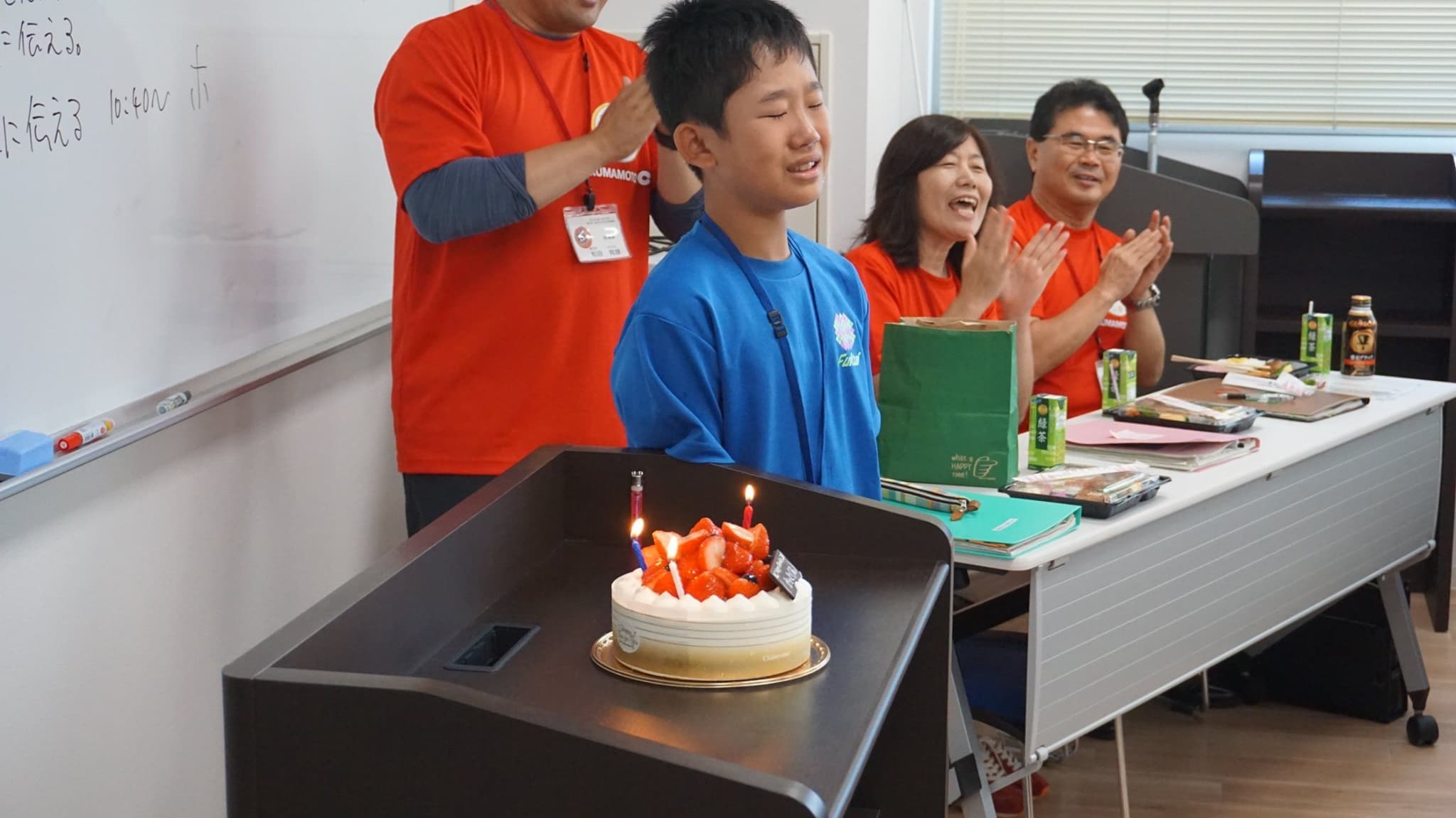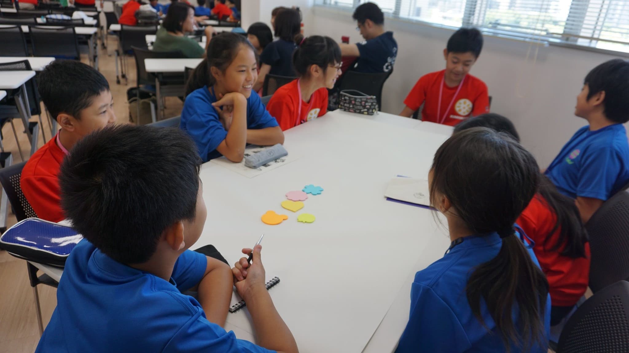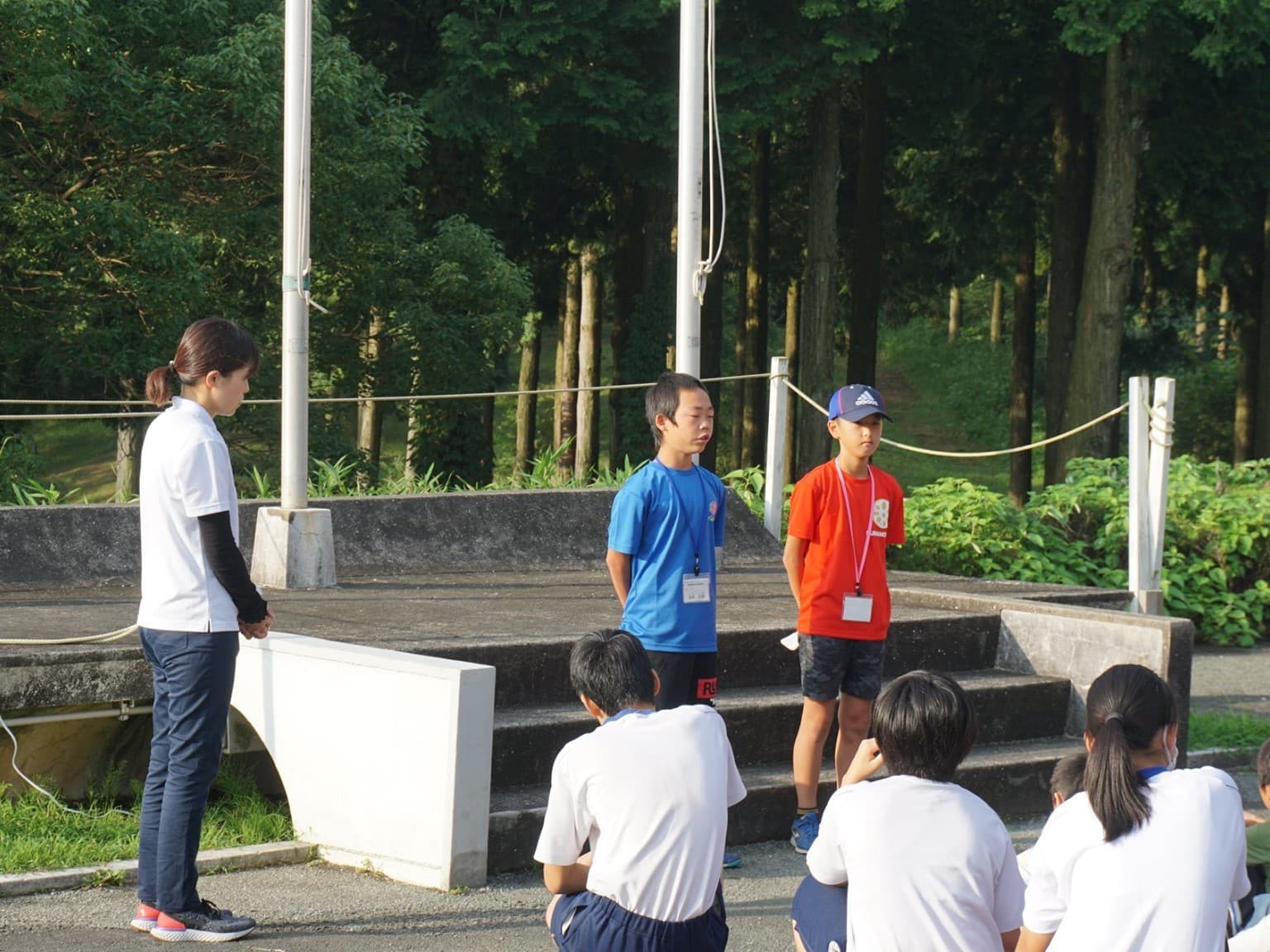 小学6年生男女12人と引率者3人は,青いTシャツを見て,同じ仲間であることを確認し,少し安心した様子。