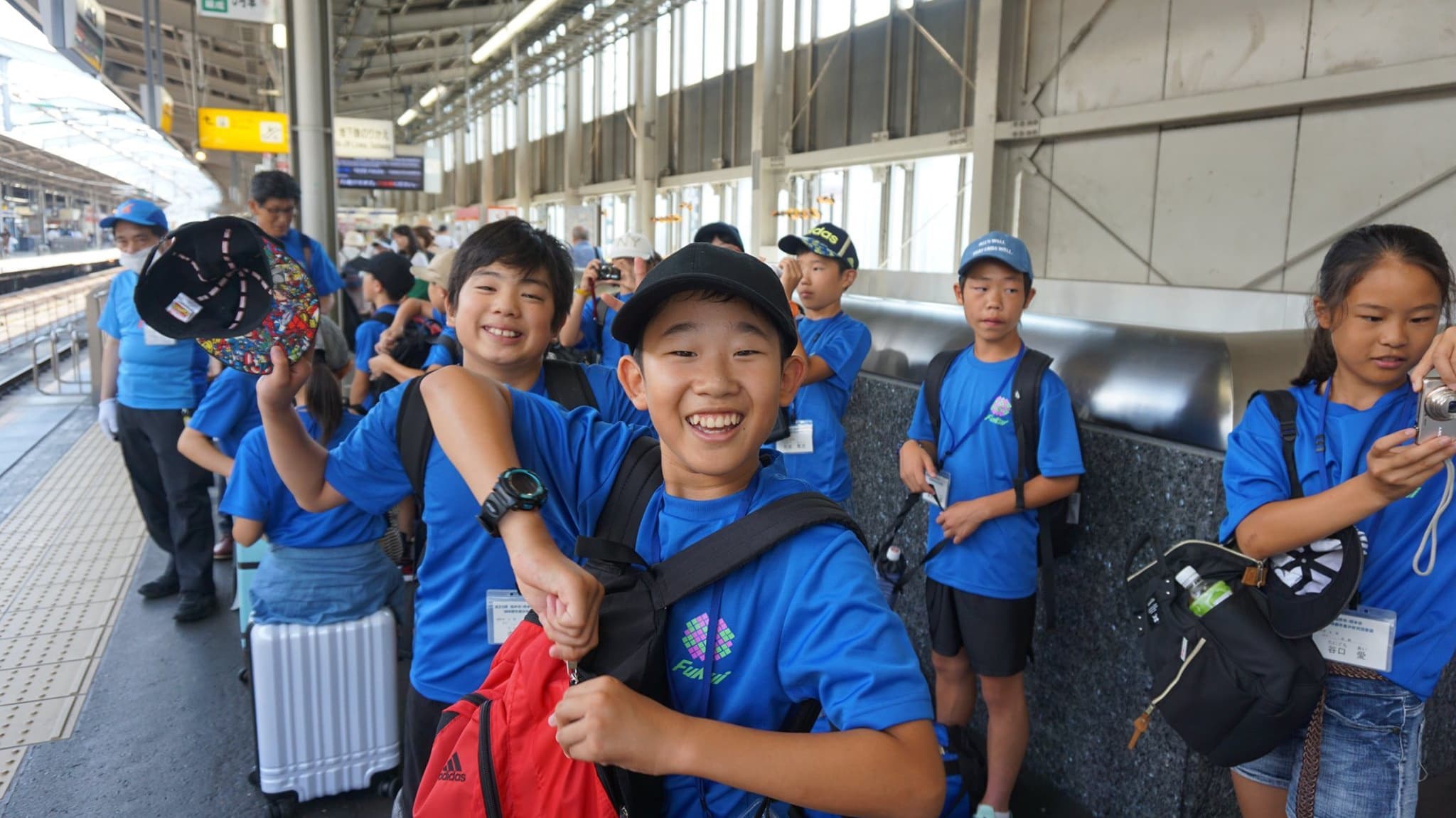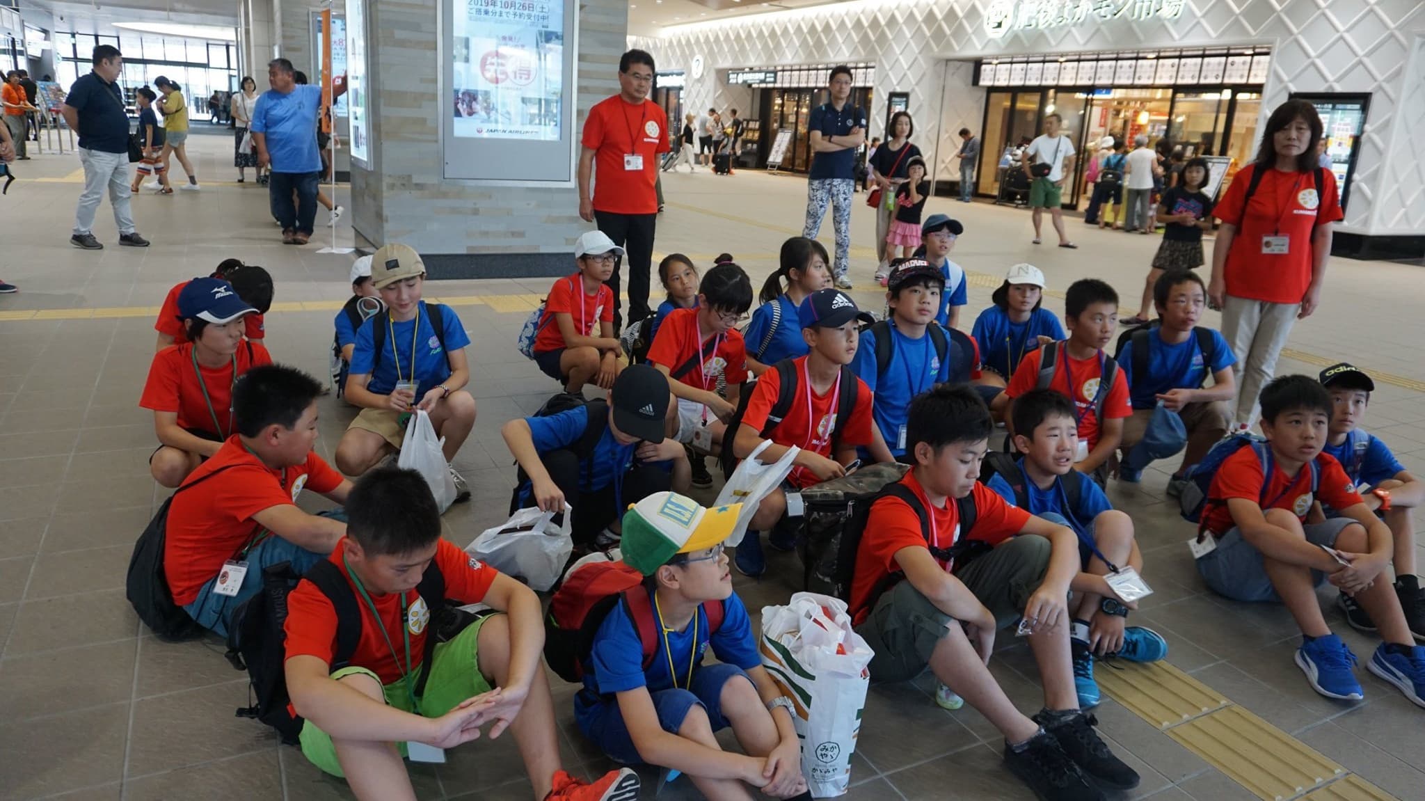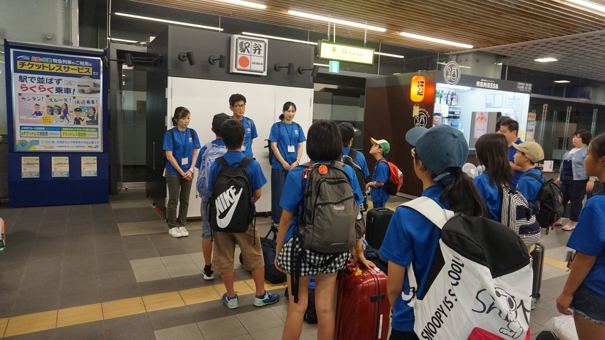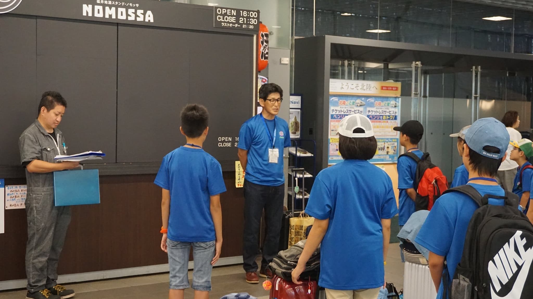 福井市団の団服である青色のTシャツを着た子供たちが,楽しみと不安と眠さが折り混ざったような表情で福井駅構内に集まってきた。