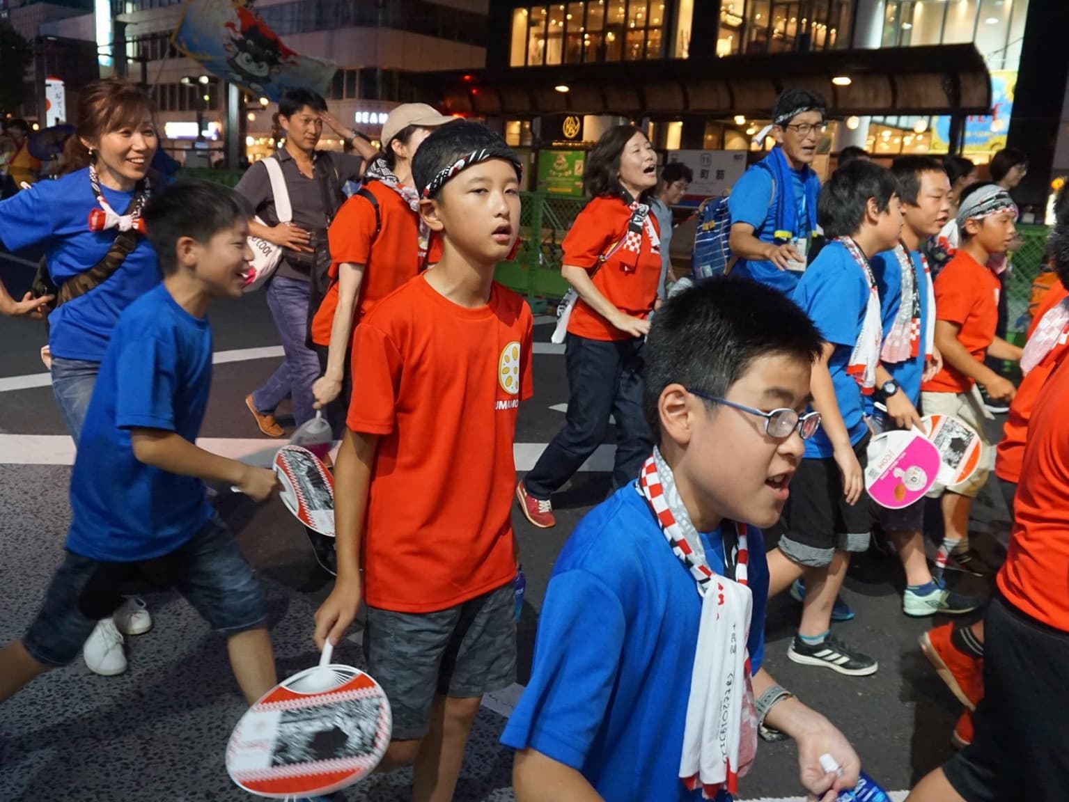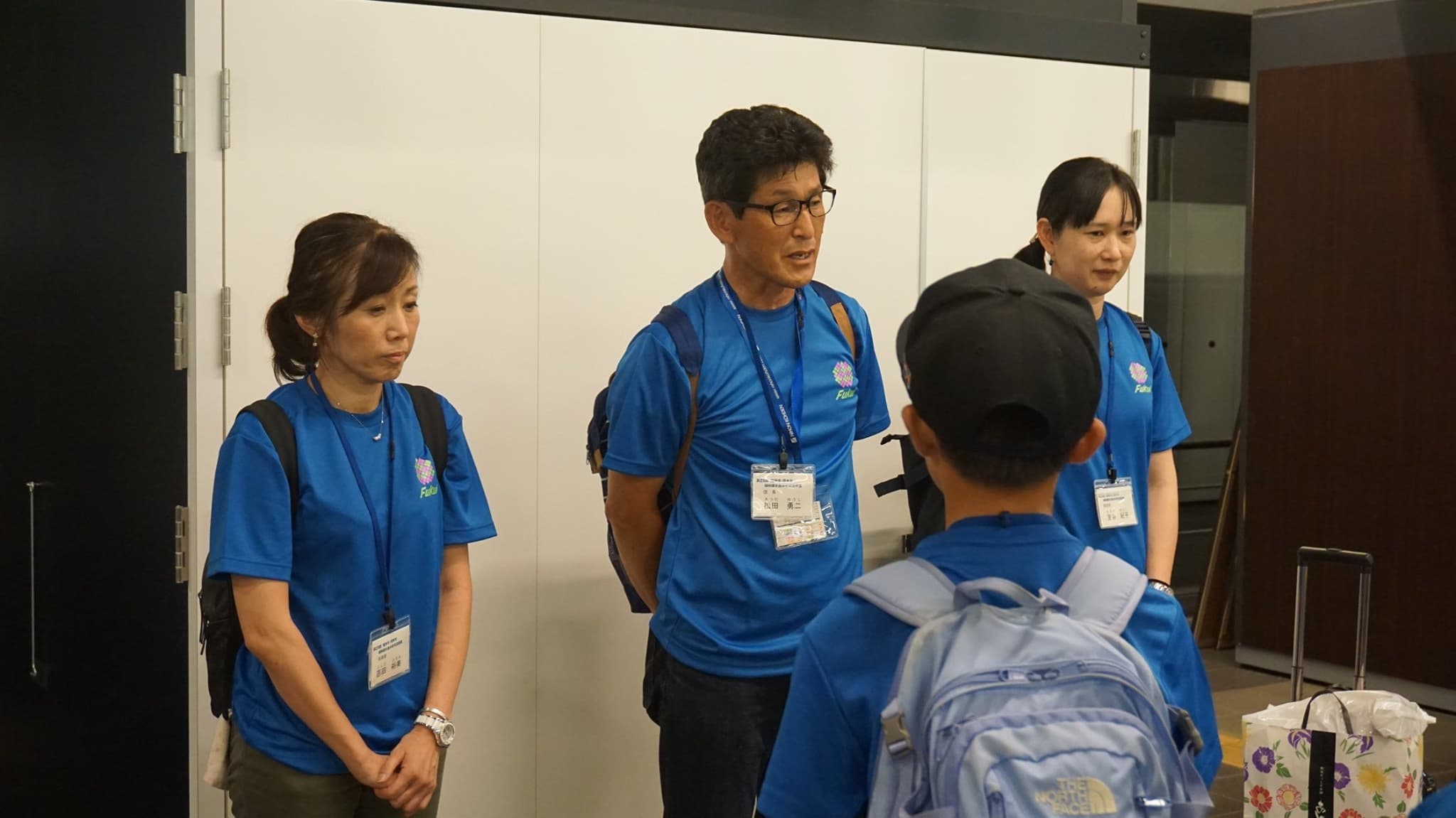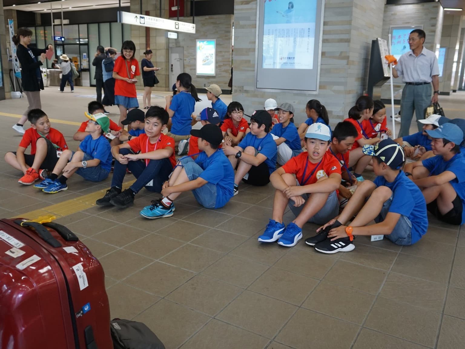 福井市団の団服である青色のTシャツを着た子供たちが,楽しみと不安と眠さが折り混ざったような表情で福井駅構内に集まってきた。