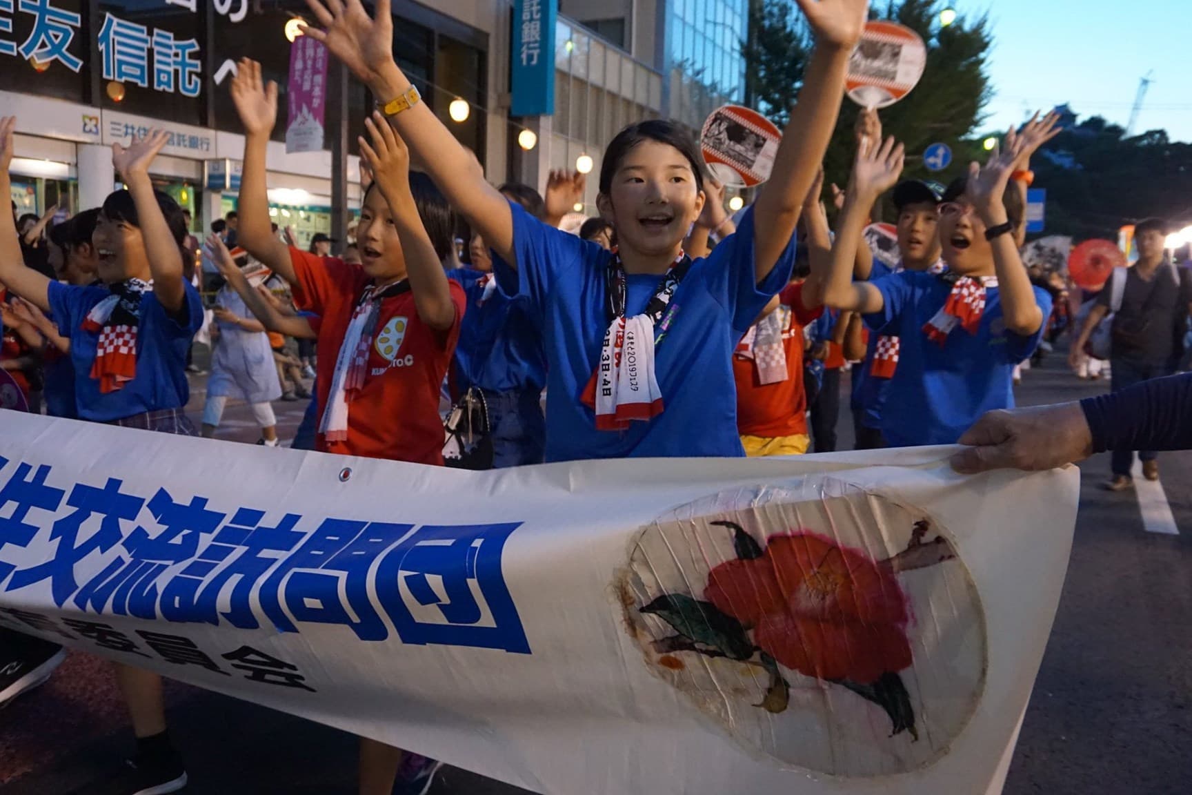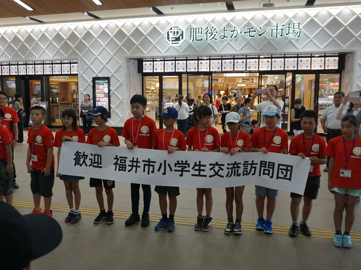 熊本駅では熊本の子どもたちが横断幕を持ってお出迎え。