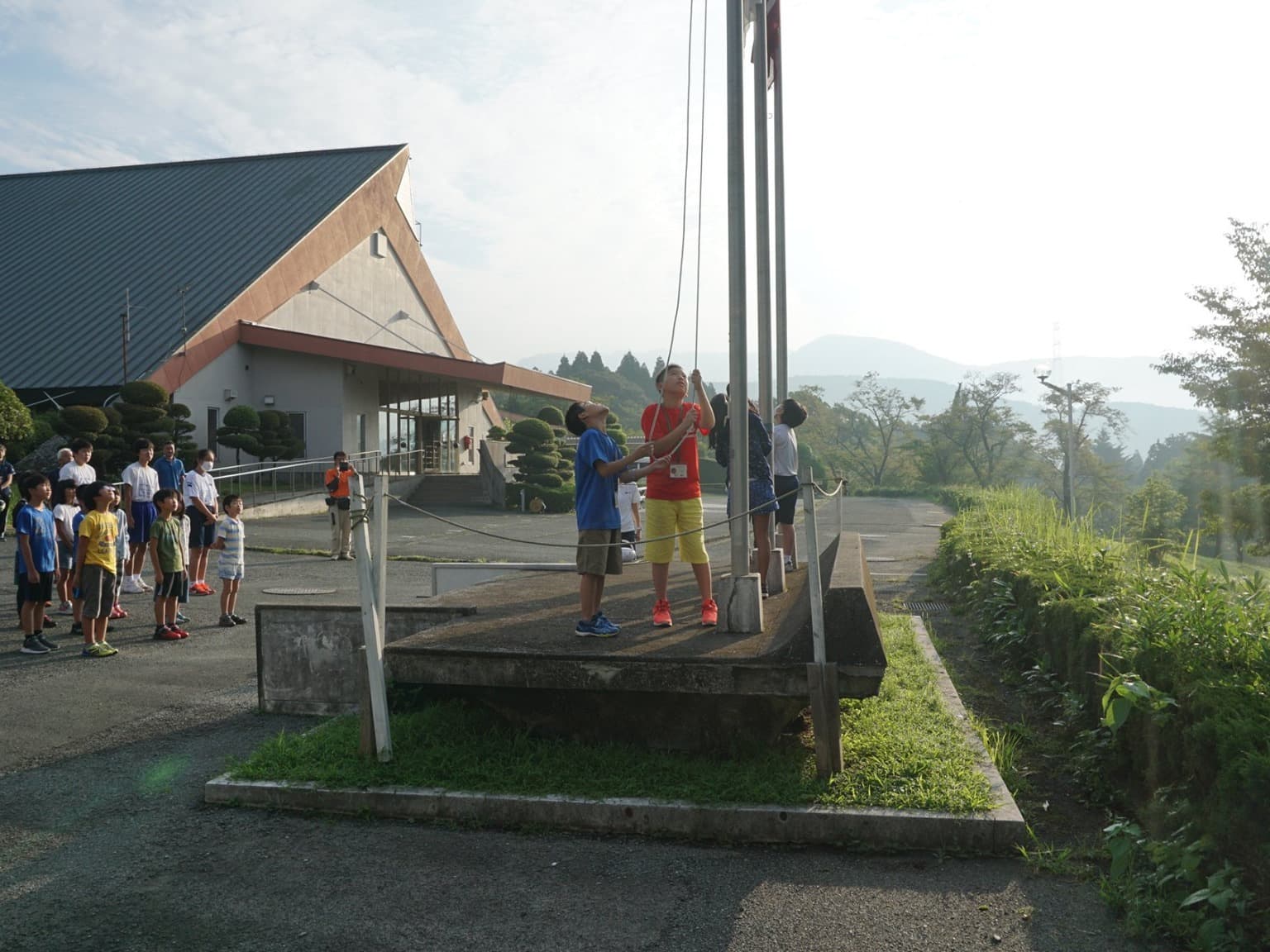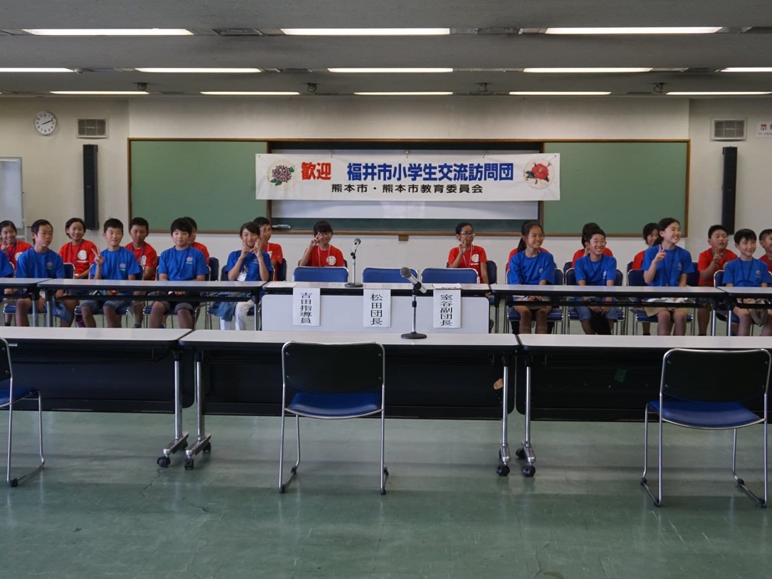 教育長をはじめ青少年課,広報課,報道関係者,市子連関係者の方々の出迎えを受け,歓迎式へ。